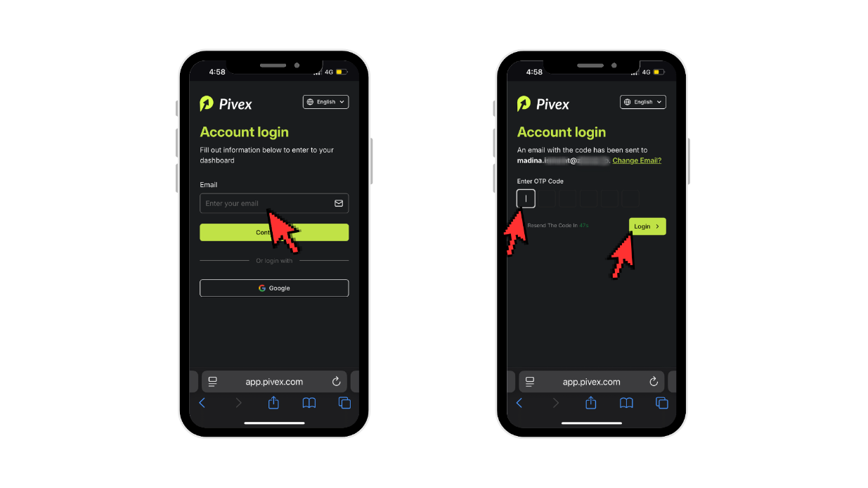 Go to app.pivex.com, enter your email, and use the one-time code sent to your inbox to sign in.